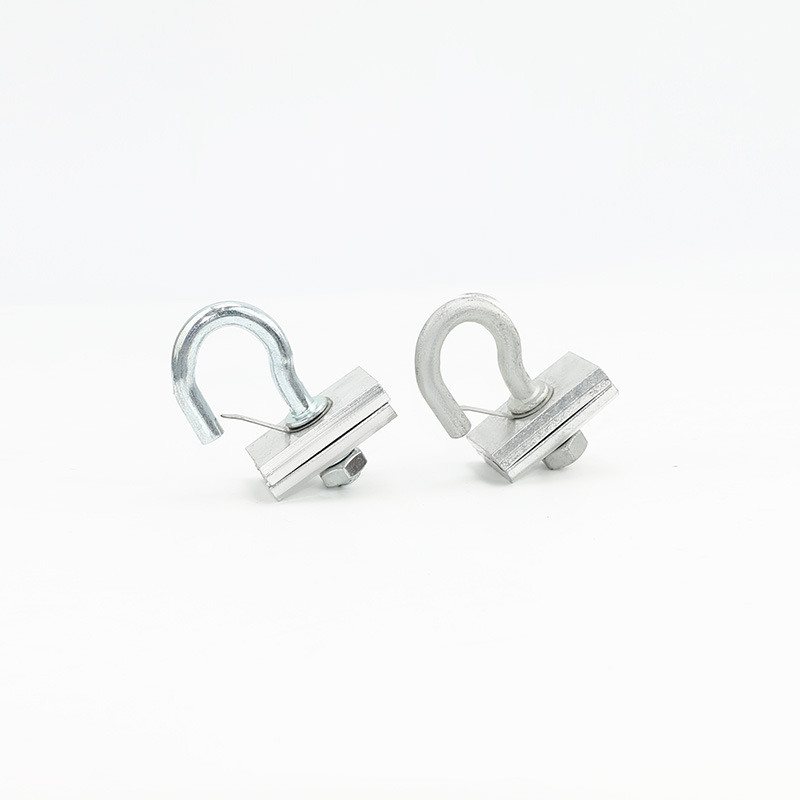 C type clamp hook for fiber optic cabling, used for hanging cable. The body is made of galvanized steel (hot-dip galvanized for durability in rural environments and to maintain good reliability). It is easy to install and operate, and it is effective and time-saving for cabling.